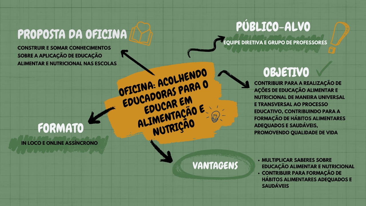 A oficina “Acolhendo Educadoras para o Educar em Alimentação e Nutrição” tem o objetivo contribuir para a realização de ações de Educação Alimentar e Nutricional de maneira universal e transversal ao processo educativo, contribuindo para a formação de hábitos alimentares adequados e saudáveis, promovendo qualidade de vida.