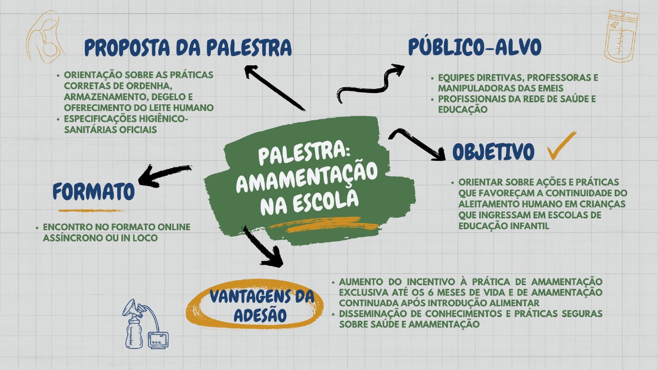 Buscando incentivar a continuidade do aleitamento humano após o ingresso da criança na escola, esta palestra tem como objetivo orientar sobre ações e práticas que favoreçam a continuidade do aleitamento humano em crianças que ingressam em escolas de educação infantil através de orientações sobre a forma correta de ordenha, armazenamento, degelo e oferecimento do leite humano.