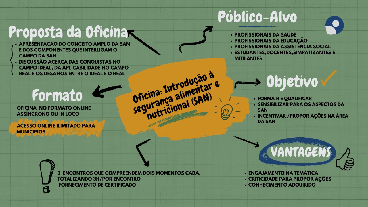 A Oficina prevê um processo de formação e capacitação para profissionais da saúde, profissionais da educação, profissionais da assistência social, além de estar direcionado para estudantes, docentes, simpatizantes e público em geral interessado na temática da Segurança Alimentar e Nutricional (SAN).